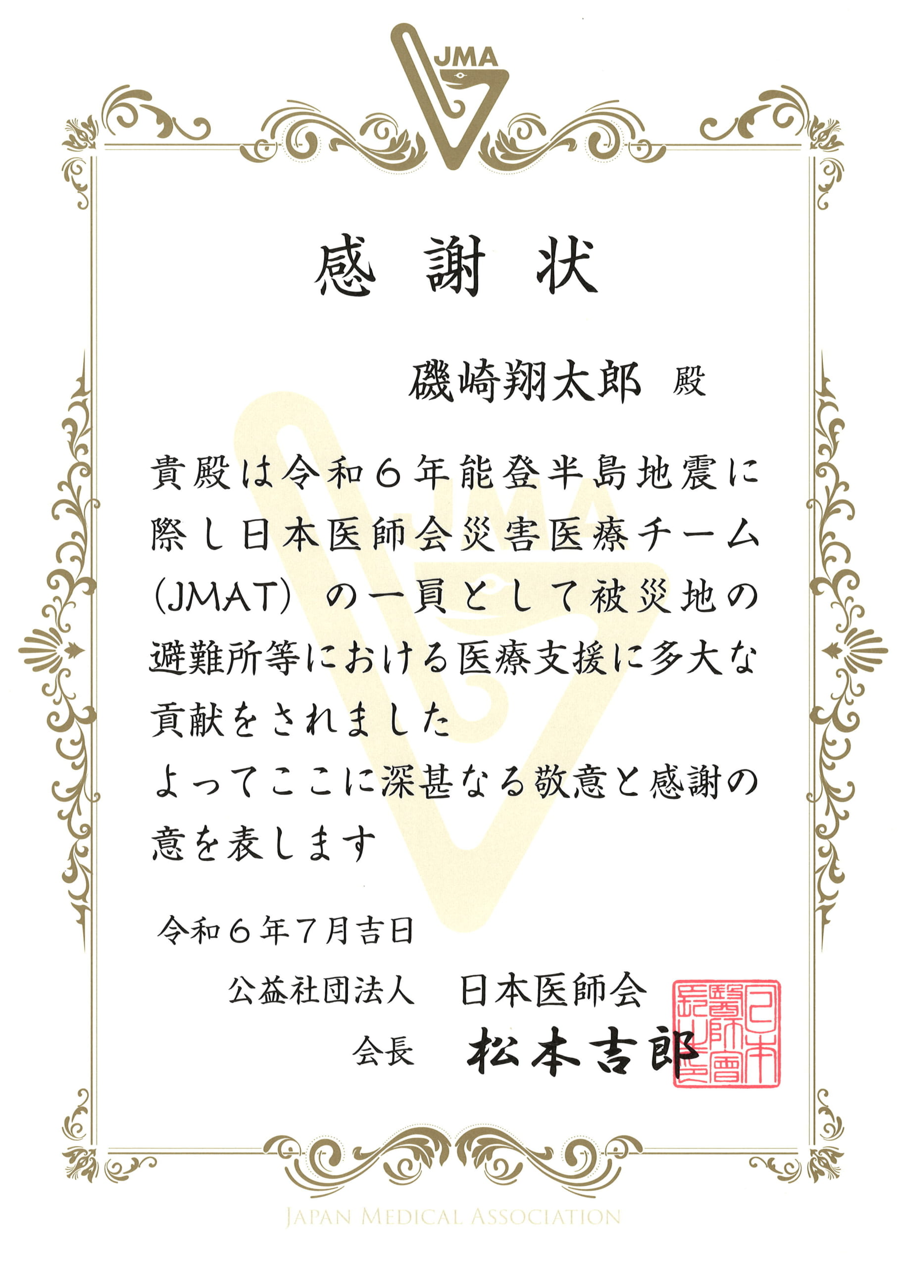 令和6年能登半島地震に際して日本医師会災害医療チーム(JMAT)の一員として被災地の医療支援に貢献したことにより、日本医師会から講師の磯崎に対し感謝状が授与されました。